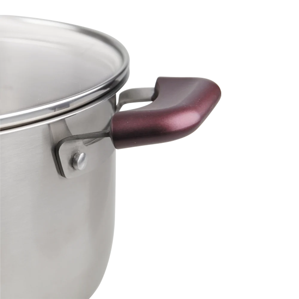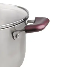 Материал: высококачественная нержавеющая сталь 18/10. Внутреннее покрытие: без покрытия. Толщина стенок: 0,5 мм. Толщина дна: 5,0 мм. Материал крышки: термостойкое стекло. Аксессуары: из бакелита, с покрытием Soft Touch. Преимущества: высокие стенки корпуса – большой литраж посуды.