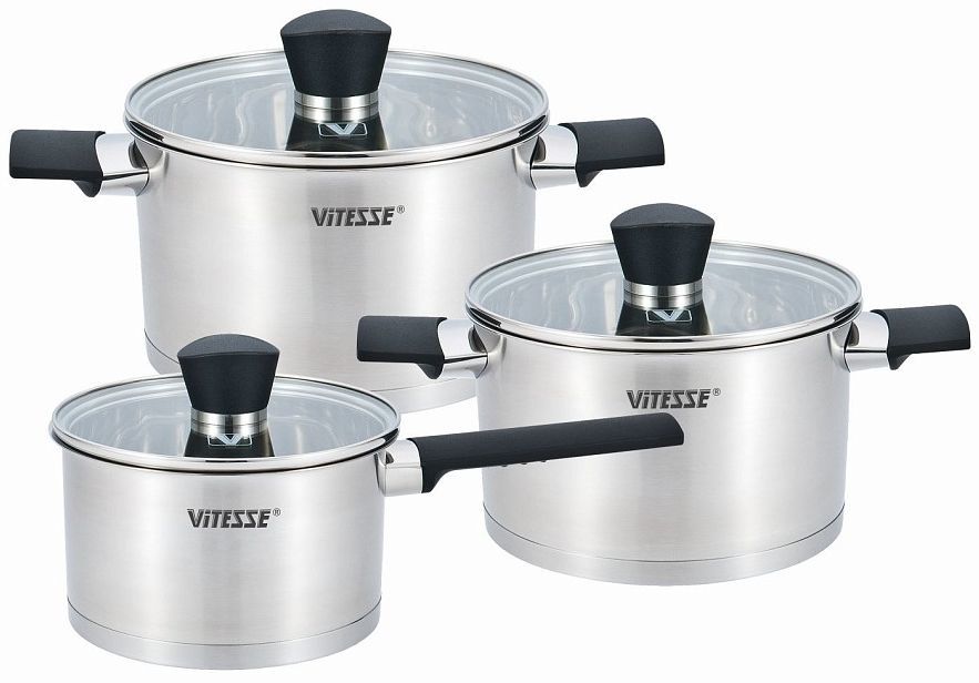 Набор посуды Vitesse Dorian из высококачественной нержавеющей стали. Многослойное термоаккумулирующее дно с прослойкой алюминия для быстрого нагрева и равномерного распределения тепла по поверхности посуды. Крышка из прозрачного термостойкого стекла с ободом из нержавеющей стали.