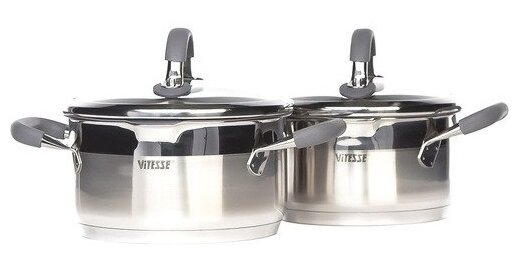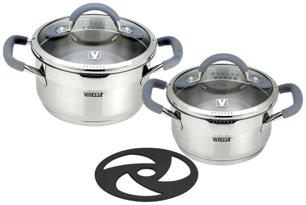 кастрюли: 3.3 л, 2.4 л; 2 крышки; бакелитовая подставка подставка