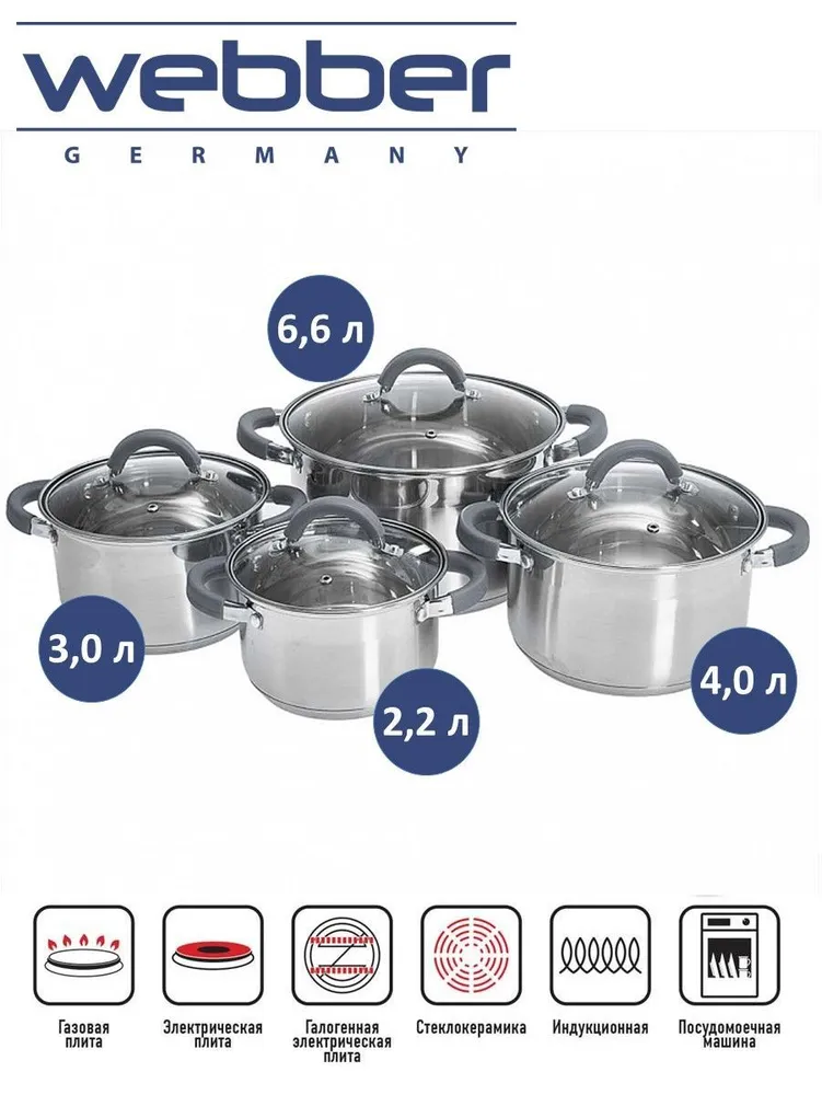 Набор посуды, WEBBER BE-626/8, 8 предметов: 4 кастрюли, из нержавеющей стали со стеклянными крышками. Ваш надежный спутник на пути к созданию кулинарных шедевров. С ним вы будете готовить легко, благодаря высокому качеству и разнообразию предметов. Это означает, что у вас всегда будет подходящая кастрюля для приготовления разных блюд, как на индукционной плите, так и газовой плите.