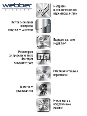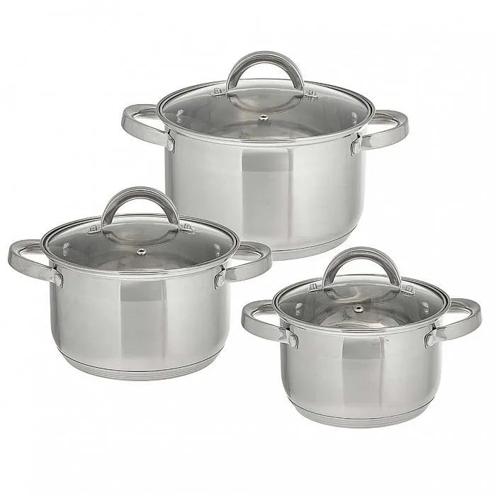 Набор кастрюль Webber BE-627/6 включает в себя шесть предметов, выполненных из прочной нержавеющей стали и стекла, устойчивого к воздействию высоких температур. Трехслойное дно отличается хорошей термоотдачей, также большая толщина стенок рабочей области минимизирует вероятность пригорания продуктов в процессе готовки. Разрешено использование посудомоечной машины для быстрого очищения загрязнений с посуды. Объем кастрюль составляет 2,2, 3 и 4 л. Возможен нагрев на любых видах плит и в духовых шкафах. Во всех крышках сделано отверстие для выпуска пара.