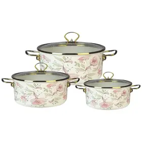 Набор кастрюль, 6 предм. (3 КАСТРЮЛИ С КРЫШКАМИ: 2,4 Л (d20 см), 3,5 Л (d22 см), 5,5 Л (d26 см) с внутренним и внешним трехслойным эмалированным покрытием, материал - углеродистая сталь. Ручки на корпусе и крышке "под золото". Подходит для индукции. Подарочная упаковка.