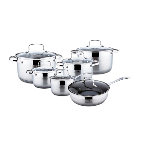 Эргономичные ненагревающиеся клепаные ручки Матовая и глянцевая полировка 7-ми слойное термоаккумулирующее индукционное дно, для моментального нагревания и сохранения тепла Высококачественная нержавеющая сталь