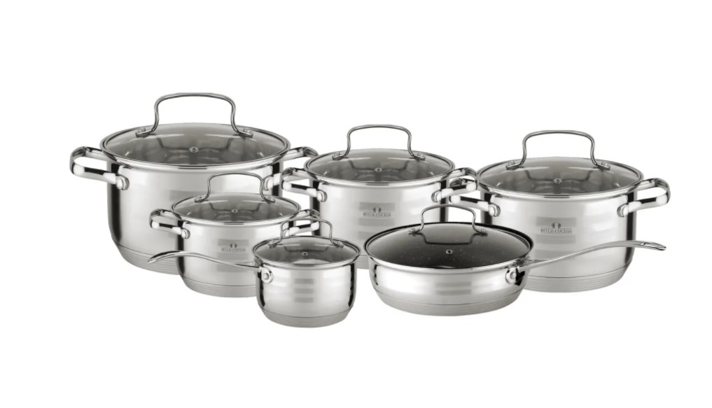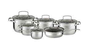 Набор посуды, 12 предметов. Кастрюля с крышкой: 16*10.5см, 2.1л; 18*11.5см 2.9л; 18*11.5см 2.9л; 20*12.5см , 3.9л; 20*12.5см , 3.9л; 24*14.5см, 6.6л. Эргономичные ненагревающиеся клепаные ручки. Матовая и глянцевая полировка. 7-ми слойное термоаккумулирующееОтзывы не найдены