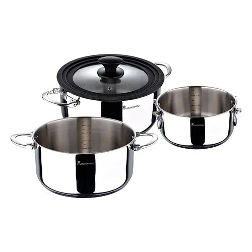 Серия кастрюль изготовлена из нержавеющей стали. Изделия быстро достигают оптимальной температуры нагрева, что позволяет экономить время приготовления. Набор состоит из 4 - х предметов: 3 кастрюли разных диаметров (16 см, 20 см и 24 см) и универсальная крышка. Набор подходит для всех видов плит.
