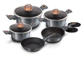 3 кастрюли: 2.5 л, 4.1 л, 6.1 л; сковорода: 20 см; сковорода-сотейник: 24 см; 3 крышки; 2 бакелитовых подставки