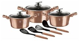 3 кастрюли: 2.5 л, 4.1 л, 6.1 л; крышка (3 шт.); кухонные принадлежности (4 шт.)