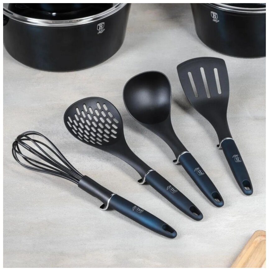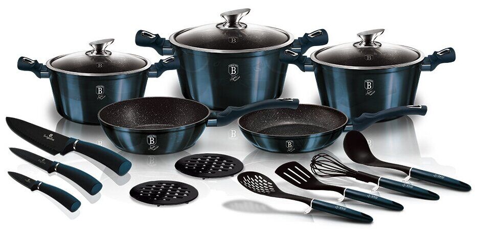 сковорода Ø24 х 6,5 см, сковорода Ø20 x 4,5 см, кастрюля - 2,5 л с крышкой Ø20 x 10 см, кастрюля - 4,1 л с крышкой Ø24 x 12 см, кастрюля -6,1 л с крышкой Ø28 x 12 см, лопатка, венчик, половник, шумовка, 2 бакелитовых подставки, 3 ножа - нож поварской, универсальный, для фруктов