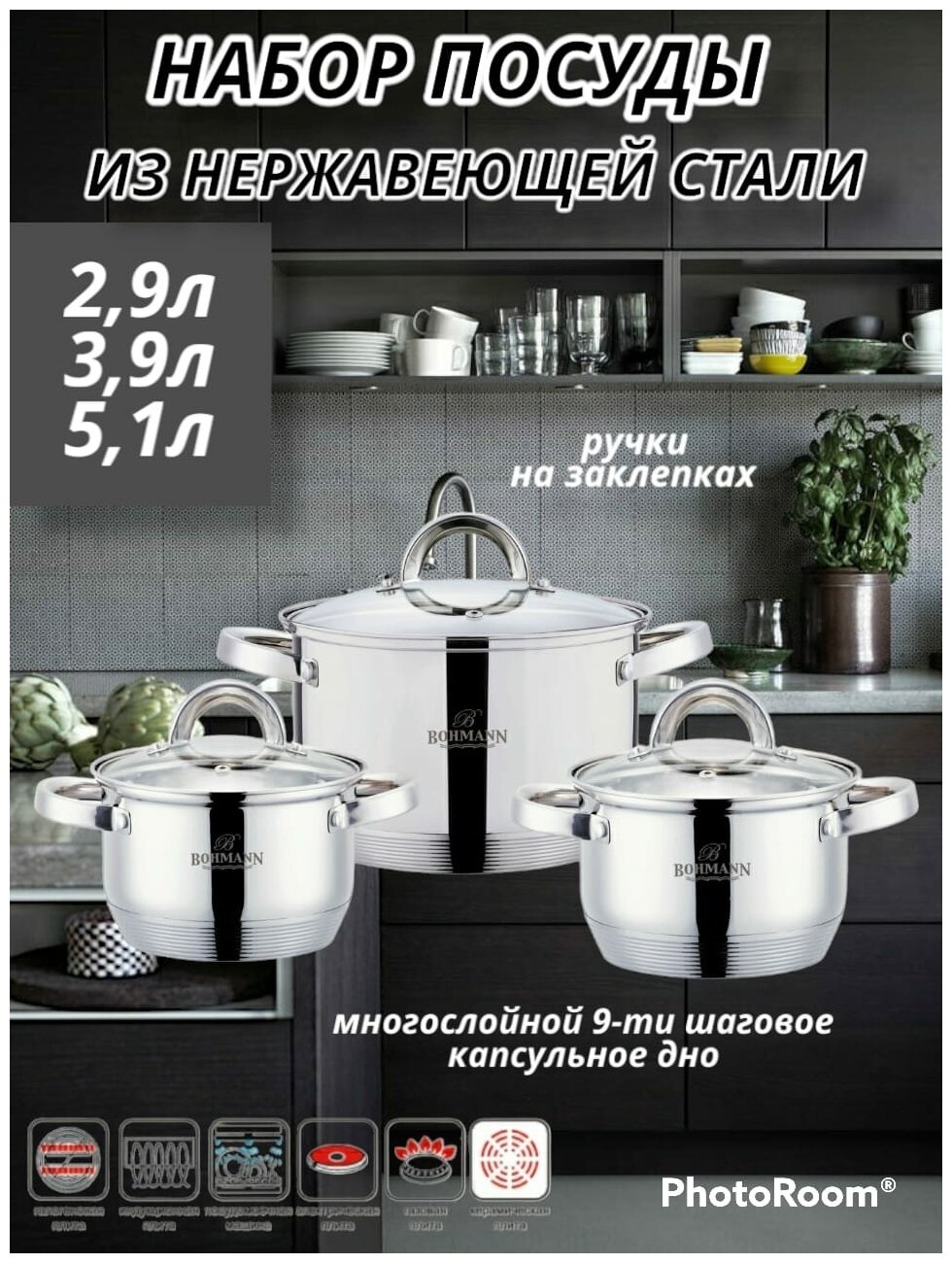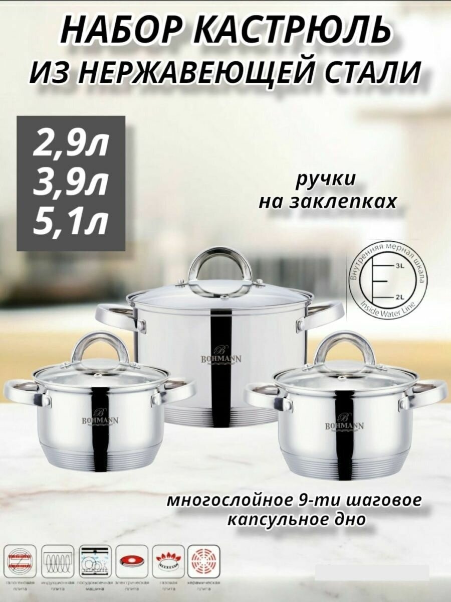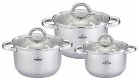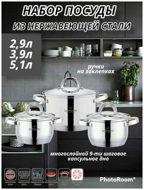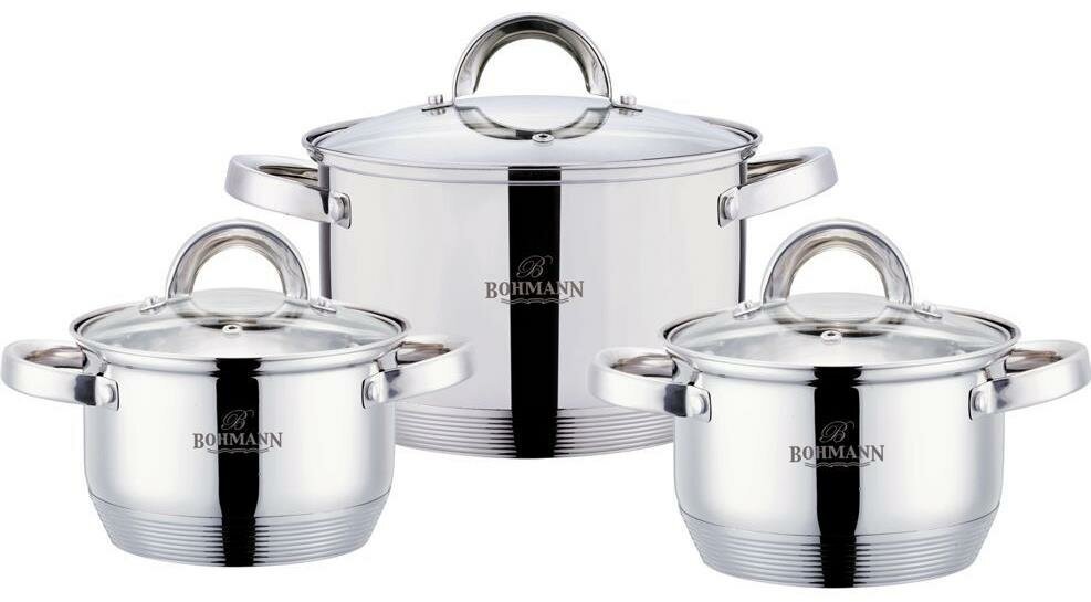 Набор из трех кастрюль, изготовленных из высококачественной нержавеющей стали CrNi 18/10. Для каждой кастрюли есть стеклянная крышка. Кастрюля с крышкой объемом 2,9 л, диаметр - 18 см, высота - 11.5 см Кастрюля с крышкой объемом 3.9 л, диаметр - 20 см, высота - 12,5 см Кастрюля с крышкой объемом 5.1 л, диаметр - 22 см, высота - 13.5 см