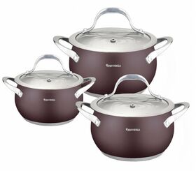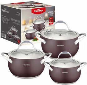 Состав комплекта: кастрюли 2,0л (16*9,5см), 2,9л (18x10,5см), 3,8л (20x11,5 см), жаропрочные стеклянные крышки 3 шт
