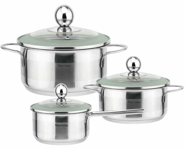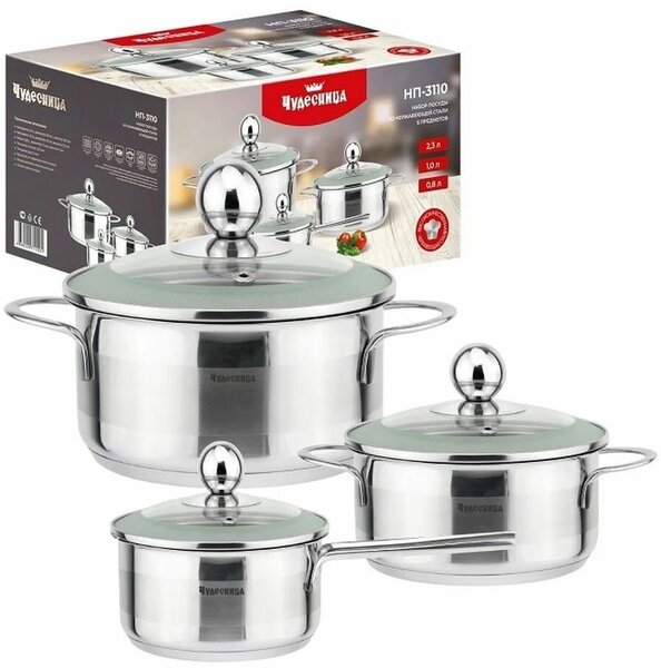Комплектация: кастрюля с крышкой 1,0л (14 см), ковш с крышкой 0,8л (12 см), кастрюля с крышкой 2,3л (18 см)