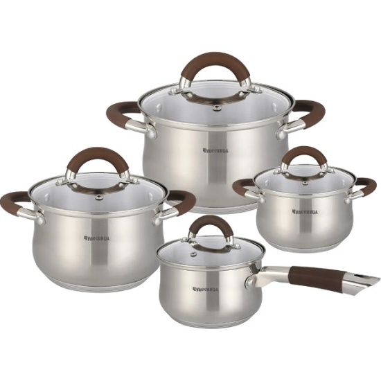 Сотейник 2,1л (1610,5см), кастрюли 2,1л (1610,5см), 2,9л (18x11,5см), 3,9л (20x12,5 см), нержавеющая сталь 18/10, крышка из жаропрочного стекла с отверстием для выхода пара, 5-ти слойное капсулированное теплоаккумулирующее индукционное дно 5см, толщина стенок 0,5 мм, шкала уровня воды, ручки с силиконовыми накладками