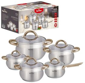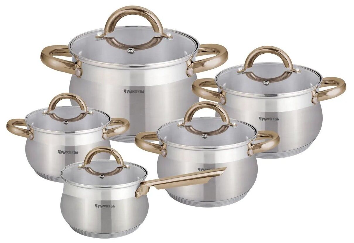 Ковш 2,1 л (161,5см), кастрюли 2,1 л (161,5см), 2,9 л (18x11,5см), 3,9 л (20x12,5 см), 5,1 л (22*13,5см), нержавеющая сталь 18/10, крышка из жаропрочного стекла с отверстием для выхода пара, 5-ти слойное капсулированное теплоаккумулирующее индукционное дно 5 см, толщина стенок 0,5 мм, шкала уровня воды.