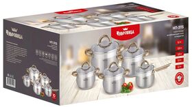 Состав комплекта: ковш 2,1л (16*10,5см), кастрюли 2,1л (16*10,5см), 2,9л (18x11,5см), 3,9л (20x12,5 см), 5,1л (22*13,5см), жаропрочные стеклянные крышки 5 шт