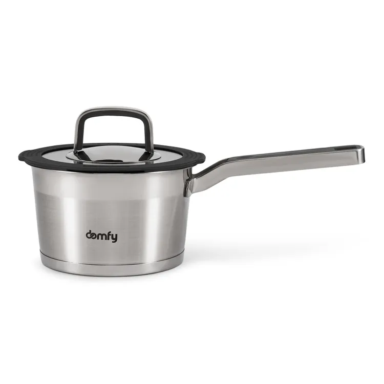 С набором посуды из 8 предметов Domfy Home Grigio вы сможете готовить одновременно несколько блюд или быстрее довести до кондиции составляющие одного. Эргономичные рукоятки помогут забыть о прихватках и рукавицах, а силиконовый кант крышек гарантирует герметичное закрытие. Кастрюля, ковш и сковорода из нержавеющей стали долговечны и удобны в эксплуатации и уходе.