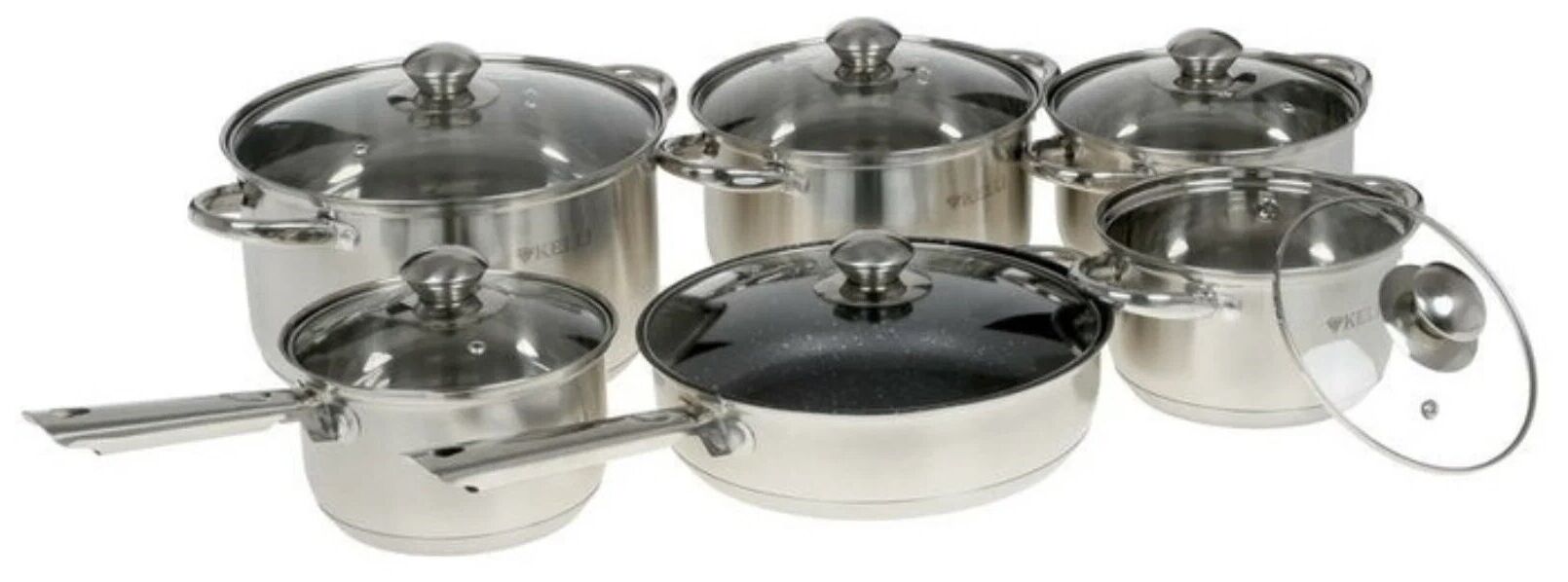 ковш: 2 л; кастрюли: 2 л, 2.6 л, 3.6 л, 6.1 л; сковорода: 24 см; 6 крышек