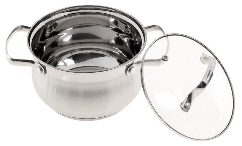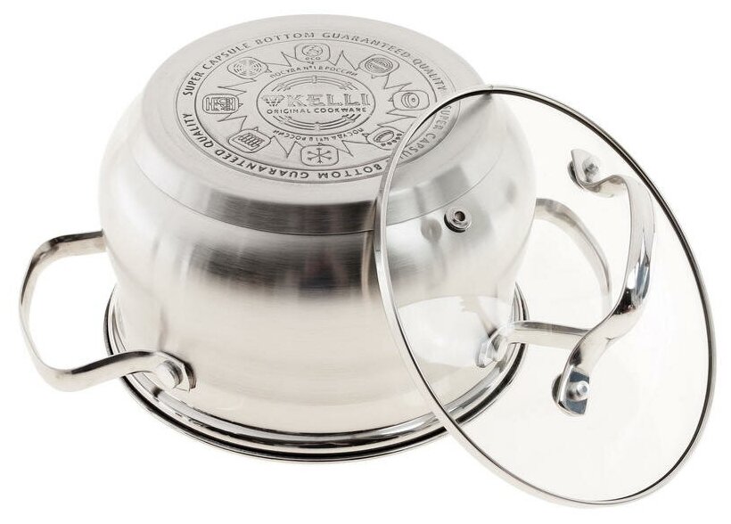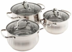 Набор посуды из высококачественной нержавеющей стали 18/10 включает в себя 6 предметов. Особенности: пятислойное капсульное дно, зеркальная поверхность. Можно использовать на всех типах плит, включая индукционную. Стеклянные крышки с паровыпуском. Удобные клёпаные ручки не нагреваются. Посуда пригодна для мытья в посудомоечной машине.