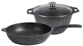 материал крышек:стекло;материал ручек:бакелит;диаметр/высота стенок:кастрюля 240х143 мм(диаметр дна 163 мм);сковорода со съемной ручкой 240х60 мм(диаметр дна 197 мм)