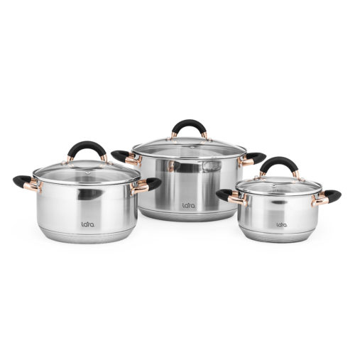 Набор кастрюль LARA эксклюзивной серии «Black and Rose» – это практичная посуда и элегантный предмет интерьера. Внутренняя мерная шкала облегчает процесс приготовления пищи, и вы сможете точно следовать выбранной рецептуре. Корпус из высокоуглеродистой нержавеющей стали AISI201 с комбинированной полировкой. Крышка с паровыпуском из жаропрочного стекла. Стальной обод C-формы для плотной фиксации. Полые ручки на заклепках с покрытием цвета розового золота. Ненагревающиеся черные силиконовые накладки на ручках для вашей безопасности. Девятиступенчатое индукционное капсулированное дно подходит для всех типов плит.