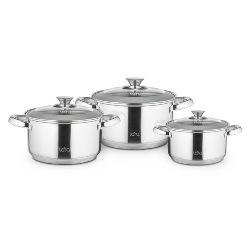Набор посуды LARA серии «Чикаго» визуально подкупает своим современным дизайном и органичным сочетанием стекла и стали. Явная эстетическая отсылка к «городу ветров», влюбляющему и притягивающему к себе людей. Вы останетесь довольны комбинацией размеров и литражей. Набор выполнен из высокоуглеродистой нержавеющей стали AISI201 с матовой полировкой. Крышка с паровыпуском изготовлена из жаропрочного стекла с сатинированием. Стальной обод C-формы плотно прилегает к стенкам. Надежные ненагревающиеся полые ручки на прочных заклепках. Семиступенчатое индукционное капсулированное дно подходит для всех типов плит.