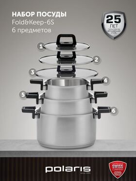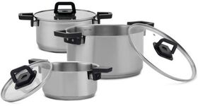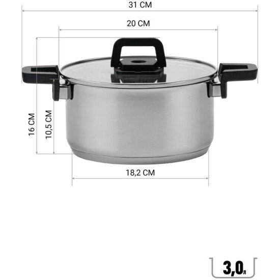 кастрюля 1.5 л - диаметр 16 см; кастрюля 3 л - диаметр 20 см; кастрюля 5.8 л - диаметр 24 см; крышки из жаропрочного стекла с отверстием для выпуска пара; складная ручка