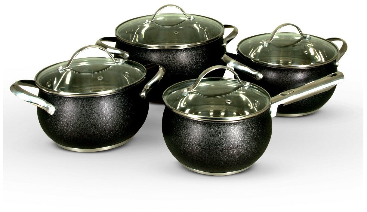 Уникальное термостойкое "снежное" покрытие сохранит посуду в отличном состоянии намного дольше. Стеклянные крышки с отверстием для выпуска пара.