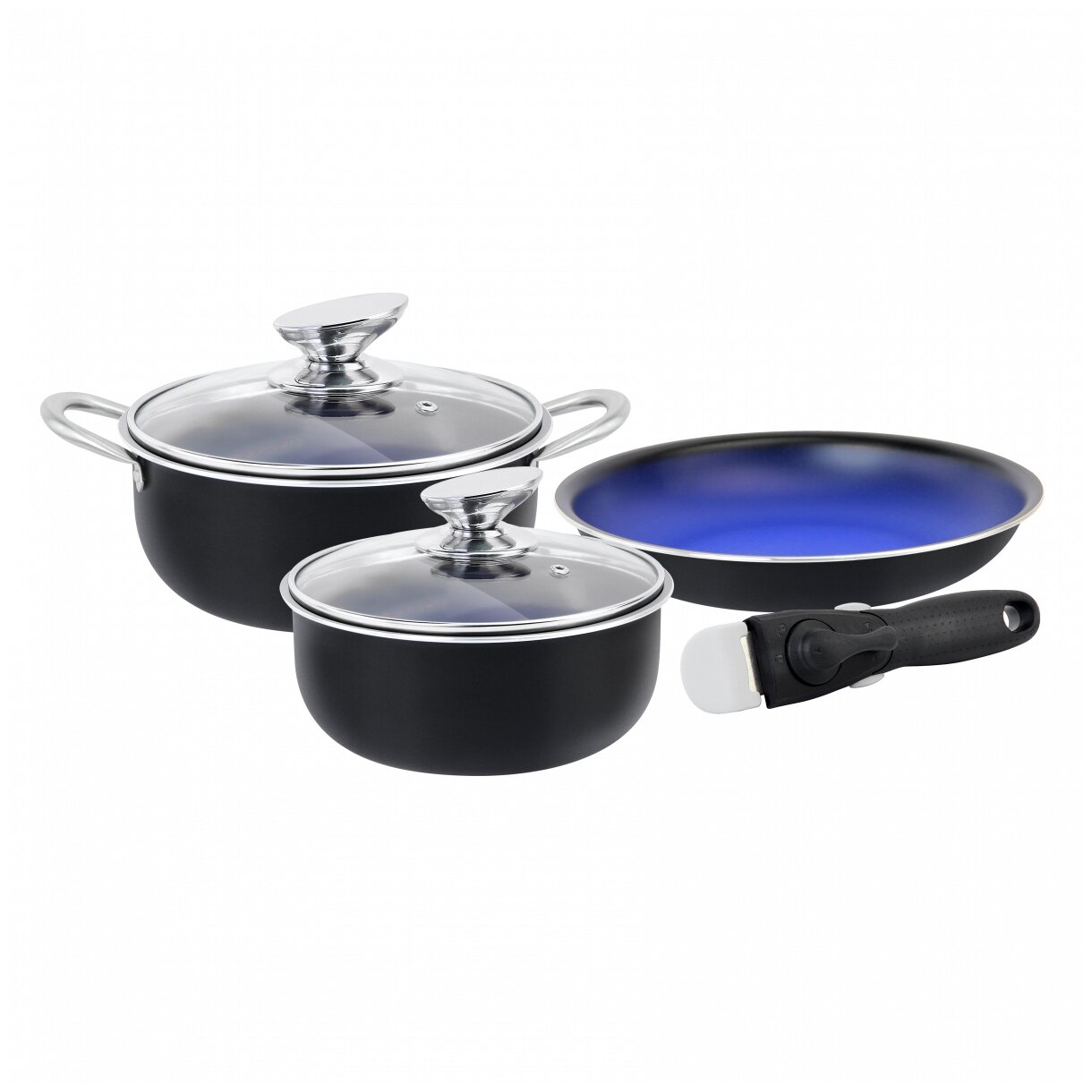 Набор посуды для приготовления со съемной ручкой. В состав набора входят кастрюля 24 см с крышкой, сковорода 24 см и ковш 18 см с крышкой со съемной ручкой.