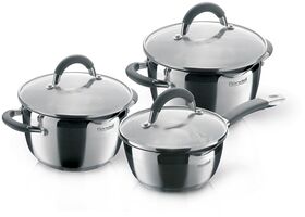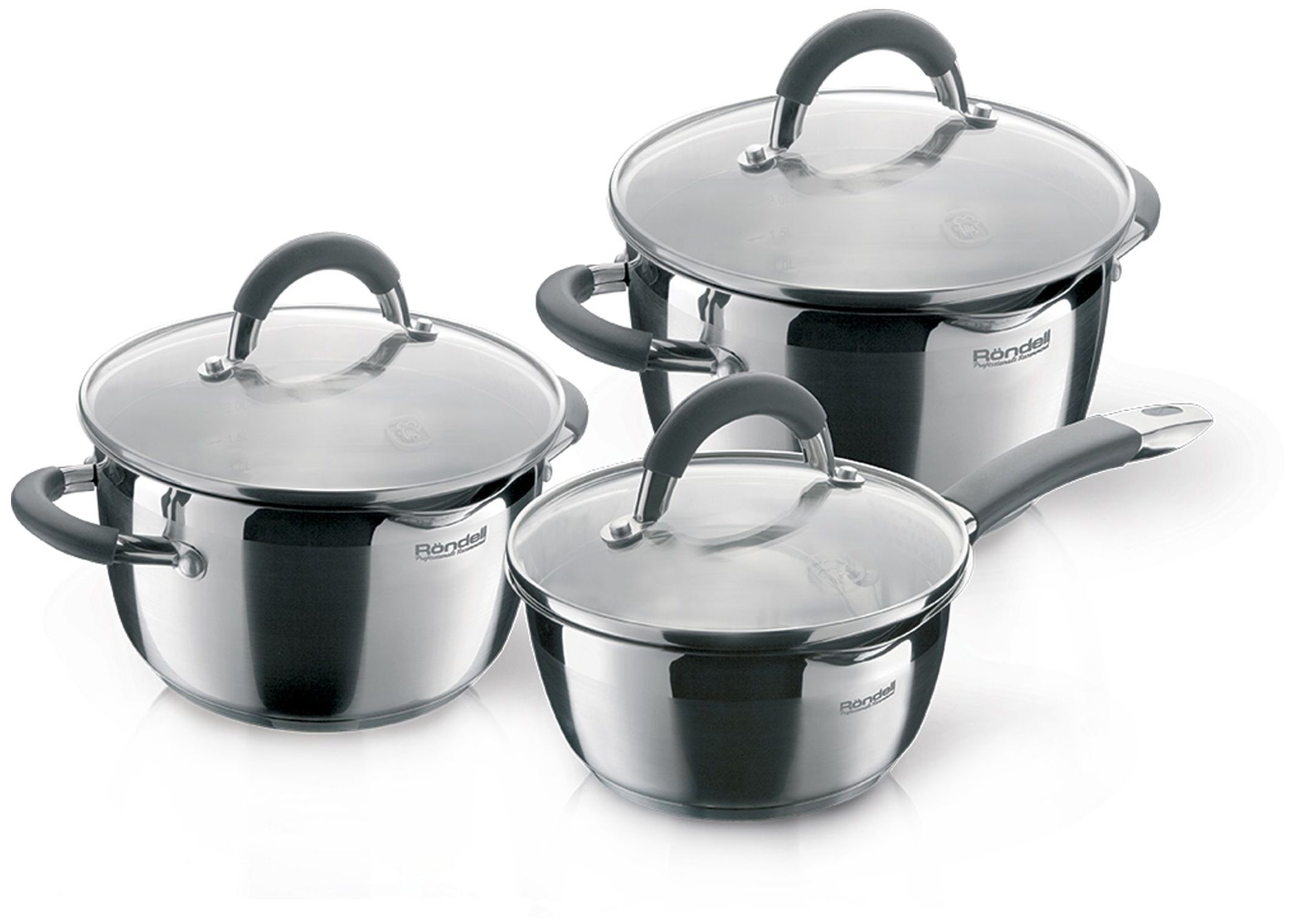 материал крышек: стекло; материал ручек: сталь; мерная шкала: есть; диаметр кастрюль: 20 см, 24 см; диаметр ковша: 16 см; буклет с рецептами от шеф-повара