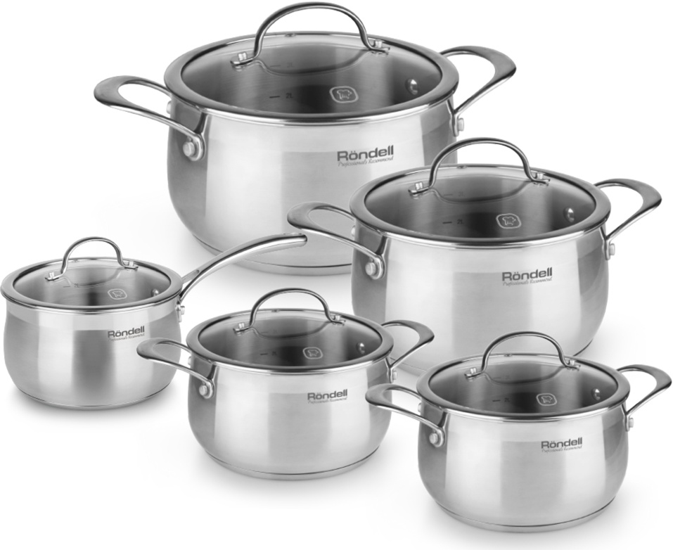 Состав комплекта: Кастрюли 18 см, 20 см, 22 см, 24 см, ковш 16 см со стеклянными крышками