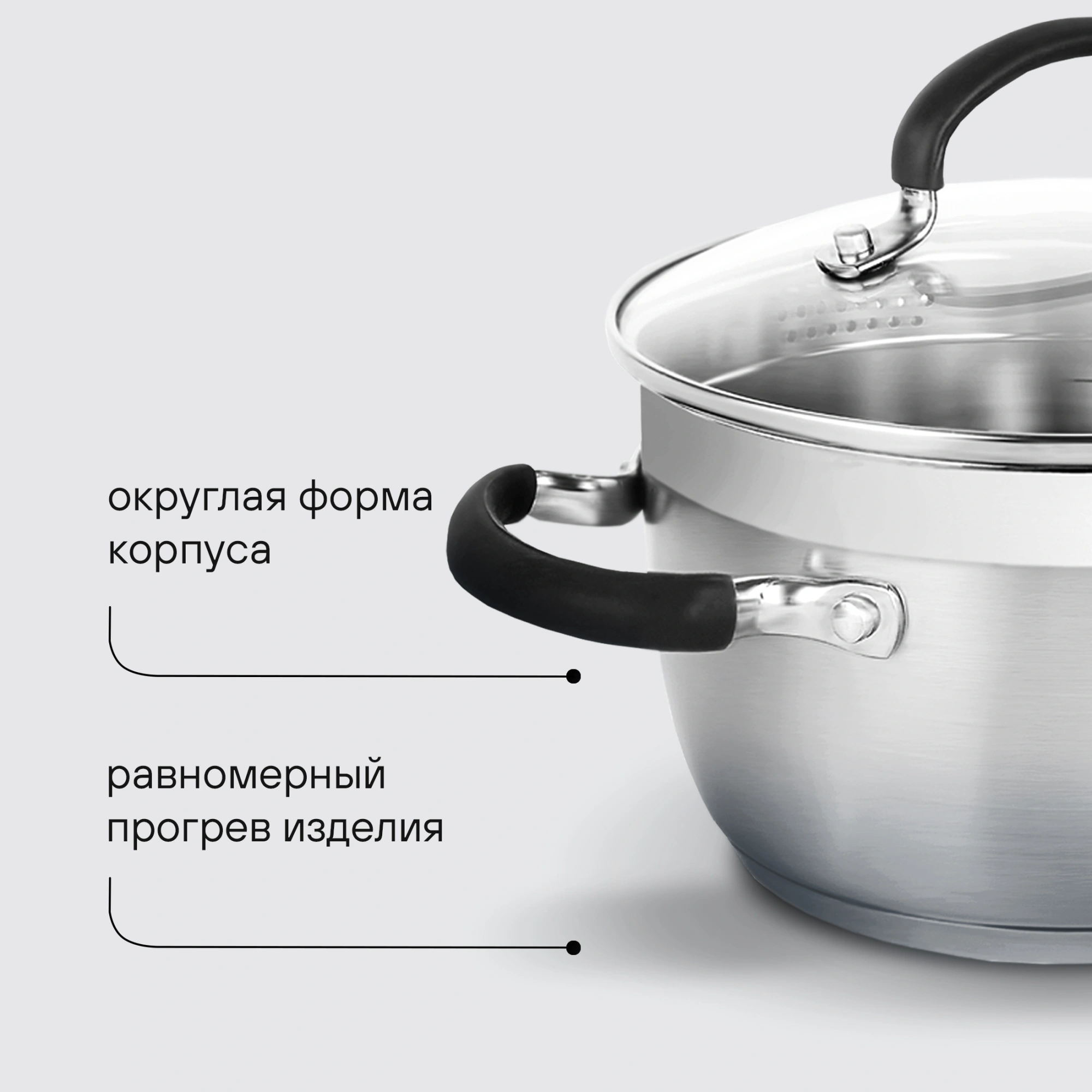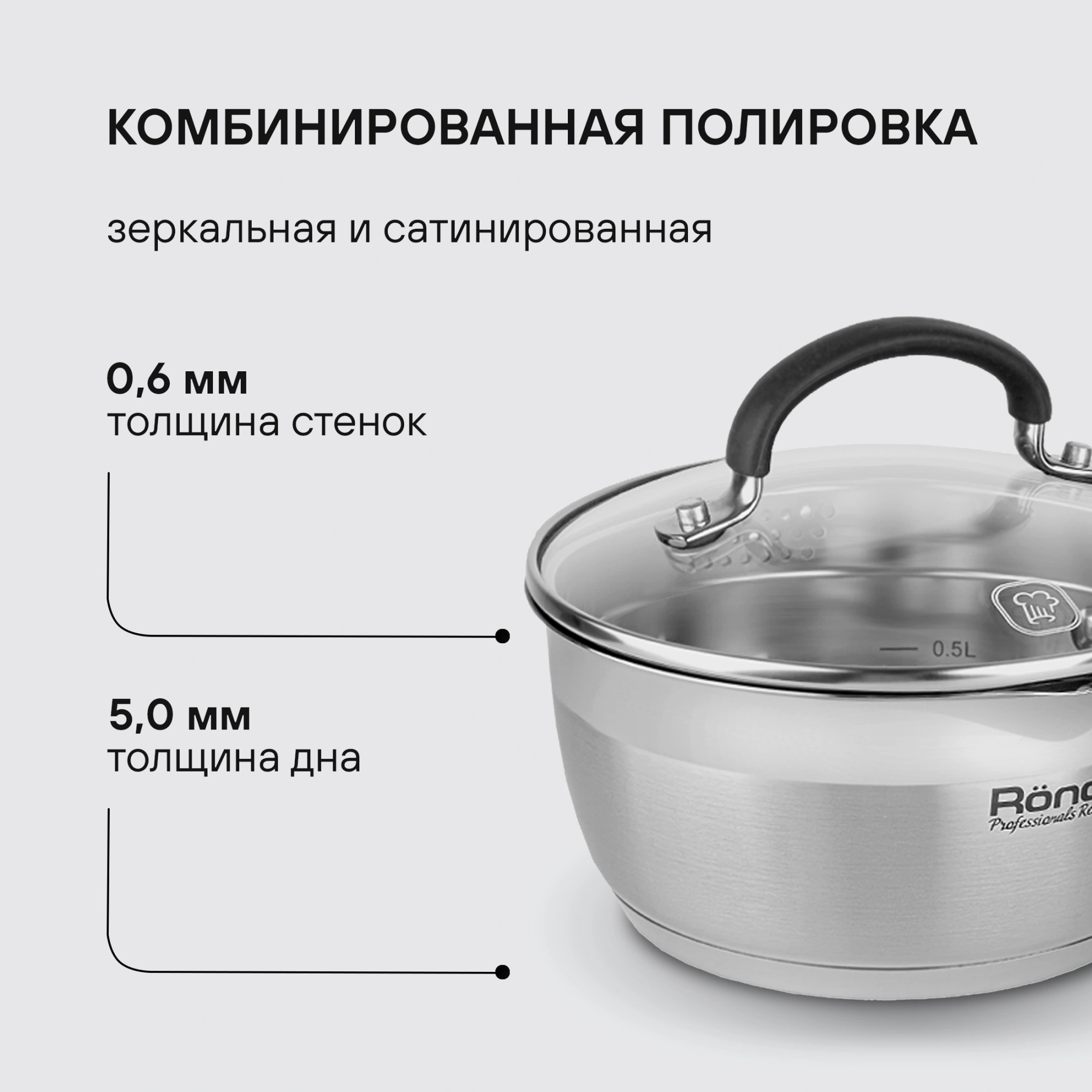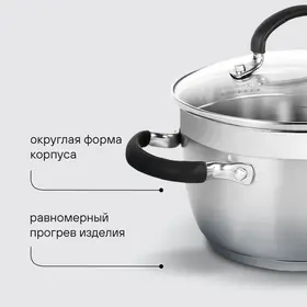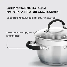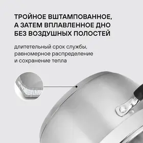 Материал: нержавеющая сталь 18/10. Толщина стенок: 0,6 мм. Толщина дна: 5,0 мм. Материал крышки: комбинированный: термостойкое стекло и нержавеющая сталь. Преимущества: комбинированная крышка из термостойкого стекла с ободком из нержавеющей стали для удобного слива жидкости (2 диаметра отверстий).