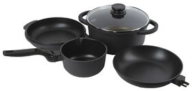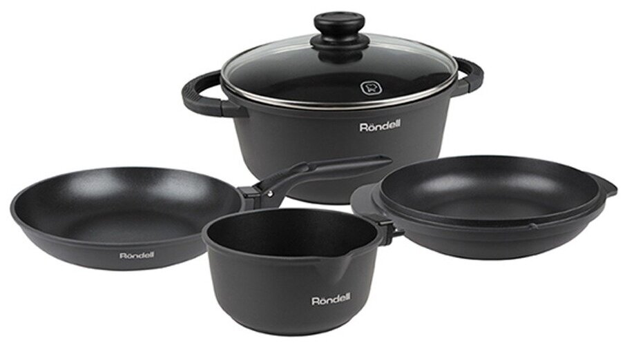 Комплектация кастрюля 5 л; сковорода 24 см; сотейник 24 см; ковш 16 см; крышка; съемная ручка