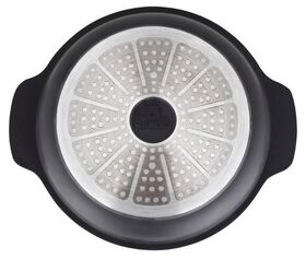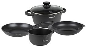 Все предметы, входящие в комплект, изготовлены из литого алюминия. Посуду можно использовать на разных видах конфорок - газовых, стеклокерамических, чугунных, галогеновых, индукционных. Также ее можно ставить в духовку.