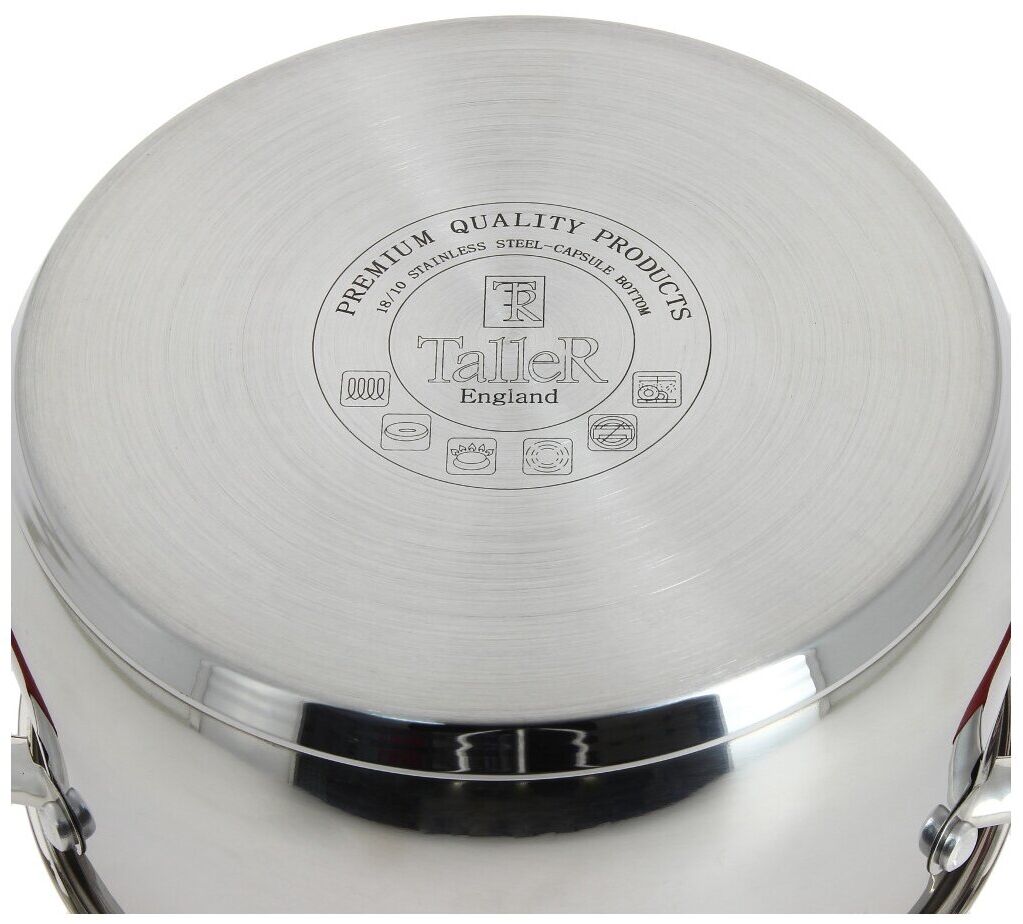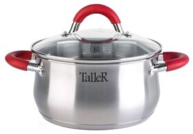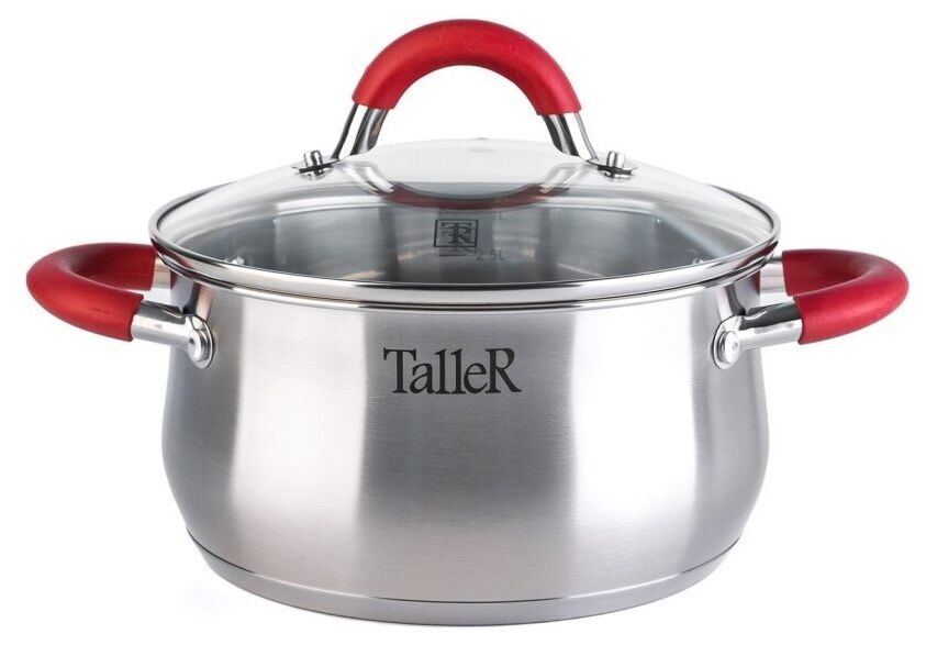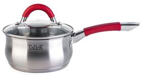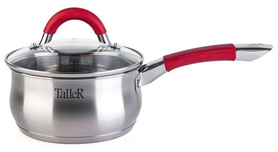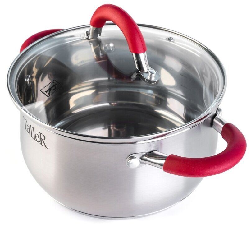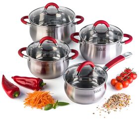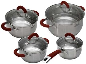 материал крышек: стекло со стальным ободом с отверстием для выхода пара; материал ручек: сталь с силиконовыми вставками; способ крепления ручек – на клепках; многослойное дно; мерная шкала: есть; ковш с крышкой 16х8 см, кастрюля с крышкой 18х9 см, кастрюля с крышкой 20х10.5 см, кастрюля с крышкой 24х11.5 см; полировка матовая снаружи, зеркальная внутри