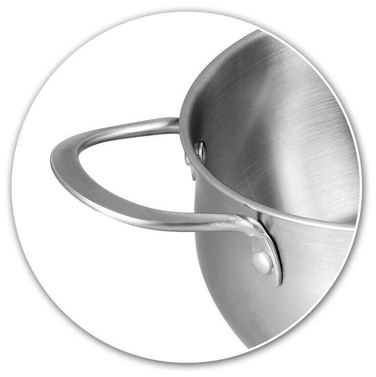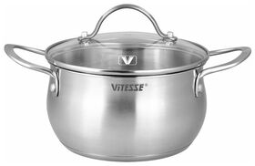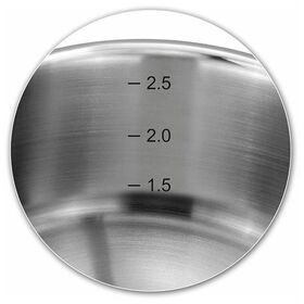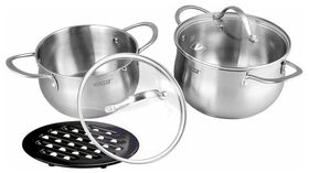 крышки из термостойкого стекла с паровыпуском; многослойное дно; материал ручек: сталь; мерная шкала: есть; диаметр кастрюль: 20 см, 18 см