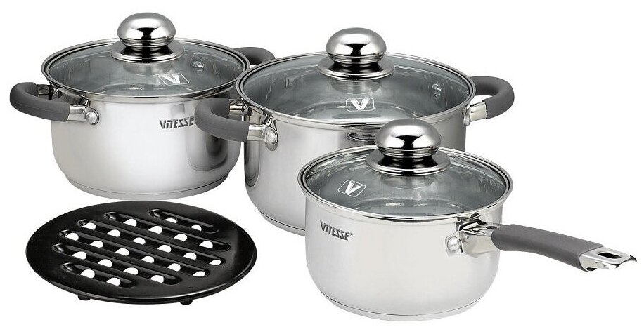 кастрюли: 3 л, 2.1 л; ковш: 1.5 л; 3 крышки; бакелитовая подставка