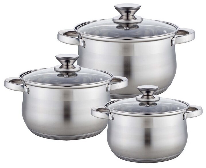 материал крышек: стекло, сталь; материал ручек: сталь; многослойное дно; кастрюли: 16х10.5 см, 18х11.5 см, 20х12.5 см