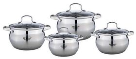 материал крышек: стекло; материал ручек: сталь; многослойное дно; мерная шкала: есть; комбинированная полировка снаружи, зеркальная полировка внутри; диаметр кастрюль: 160 мм, 180 мм, 200 мм, 240 мм