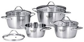 материал крышек: стекло; материал ручек: сталь; многослойное дно; мерная шкала: есть; трехслойное дно; матовая полировка внутри и снаружи; диаметр кастрюль 160 мм, 180 мм, 200 мм, 240 мм; упаковка – подарочная коробка с ремнями