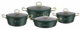 Набор посуды, 8 предметов Жаровня с крышкой 4,8 л, (Ø28 см), кастрюля с крышкой - 7,5 л (ø28 см), кастрюля с крышкой - 4,5 л (ø24 см), кастрюля с крышкой - 3,0 л (ø20 см), внутреннее И внешнее антипригарное покрытие " GRANITE PFLUON" высококачественный алюминий, металлические ручки " под золото" крышка-стекло с силиконовым ободком, индукционное ДНО, подарочная упаковка.