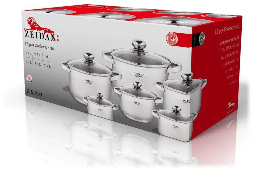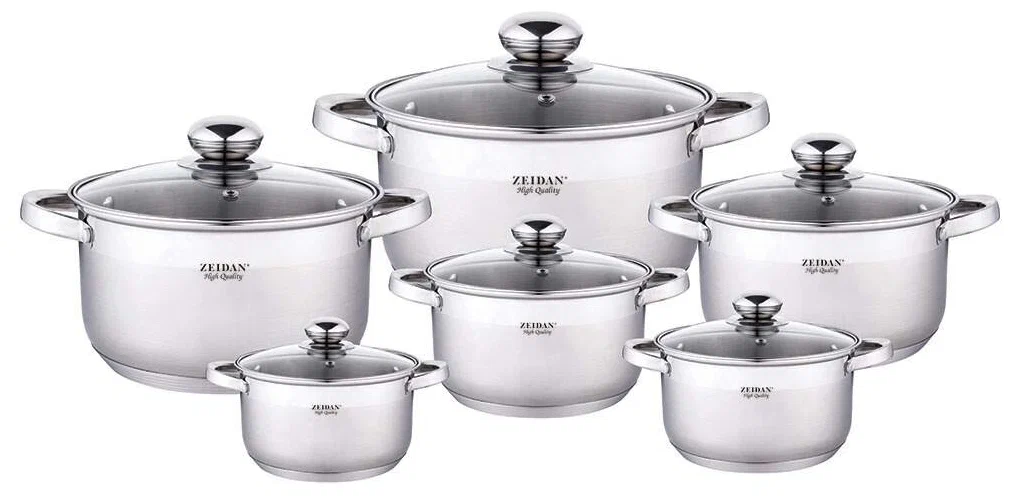 6 кастрюль: 1.9 л, 2.7 л, 3.6 л, 4.7 л, 6.1 л, 7.7 л; 6 крышек