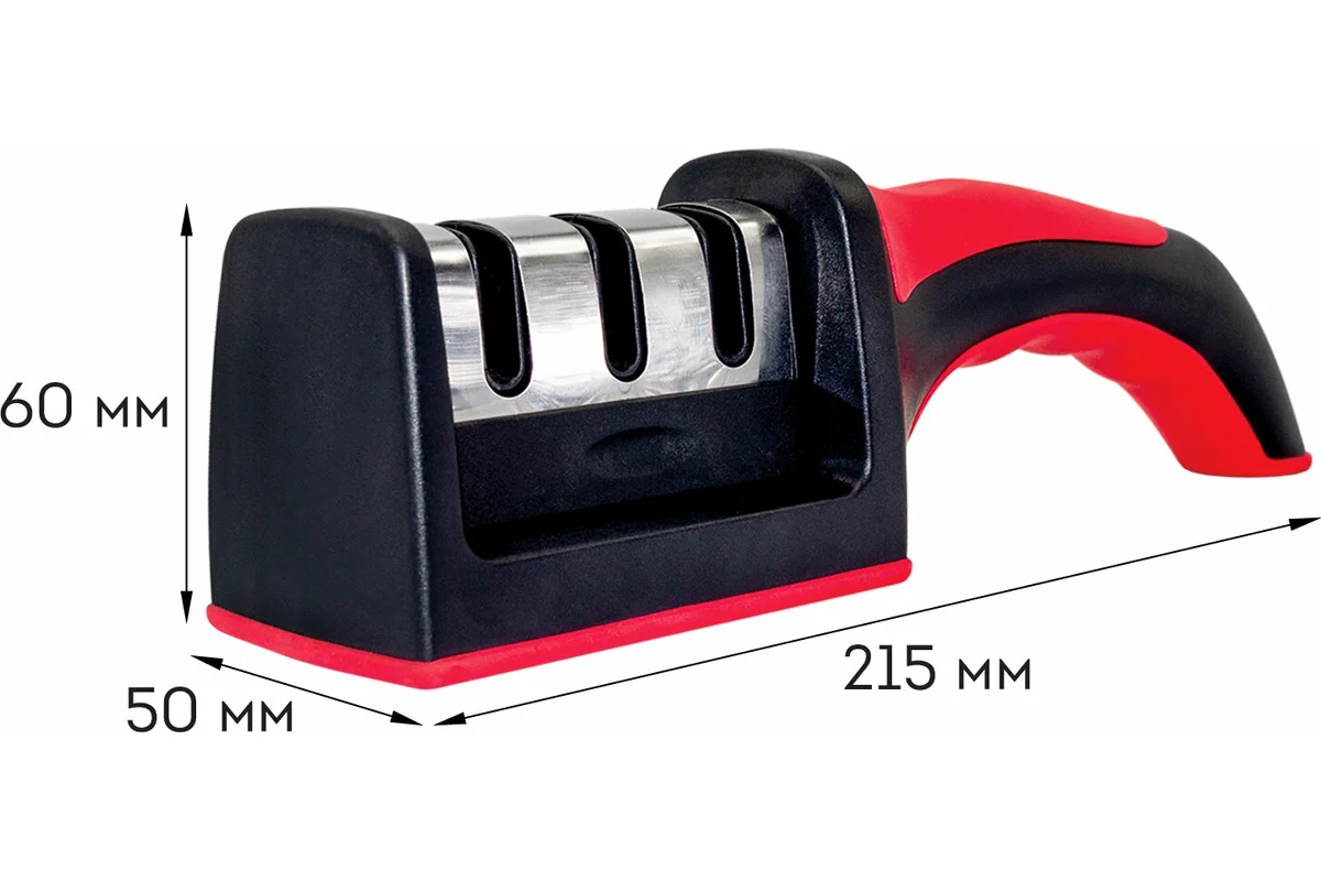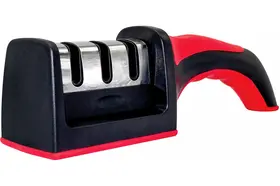 Корпус заточки для ножей выполнен из приятного на ощупь пластика и имеет удобную эргономичную ручку с удобным хватом для руки. Точилка для ножей - универсальная, подходит для правши и для левши. Прорезиненные вставки в основании не позволяют прибору скользить по столу и другим поверхностям.