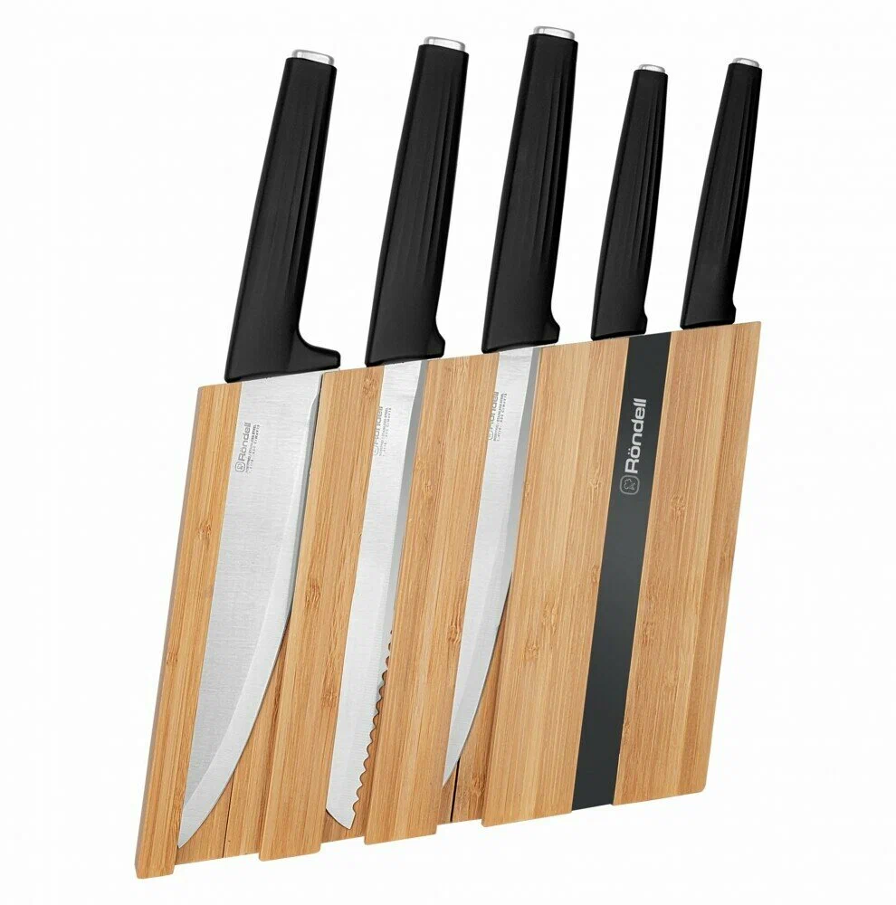 Поварской нож 20см, разделочный нож 20 см, нож для хлеба 20 см, универсальный нож 12,7см, нож для чистки овощей 9см. Вертикальная подставка сделана из бамбукового дерева.