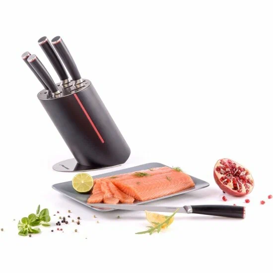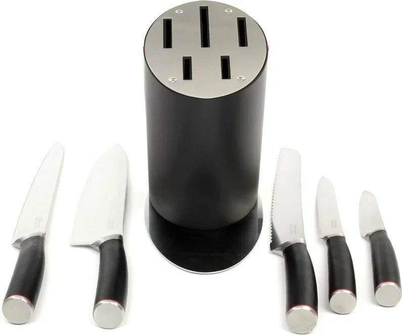 нож для овощей 9 см; нож универсальный 12,7 см; нож разделочный 20 см; нож для хлеба 20 см; нож поварской 20 см; подставка