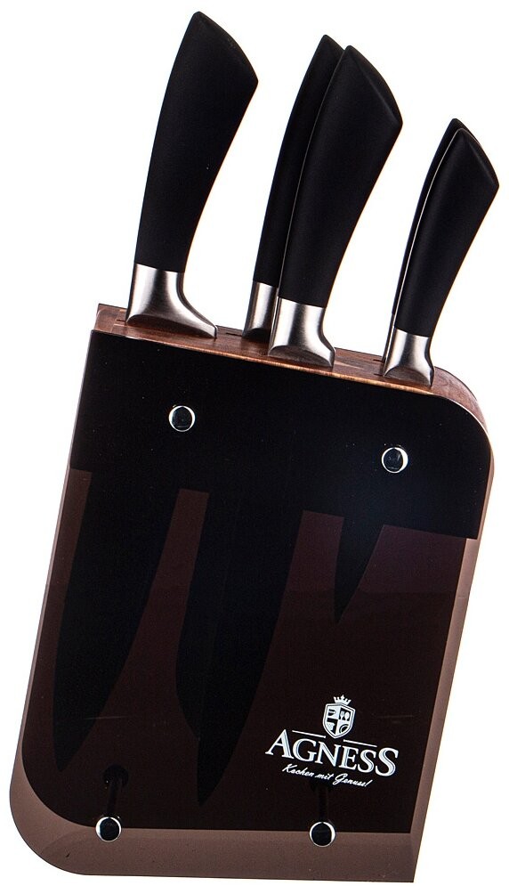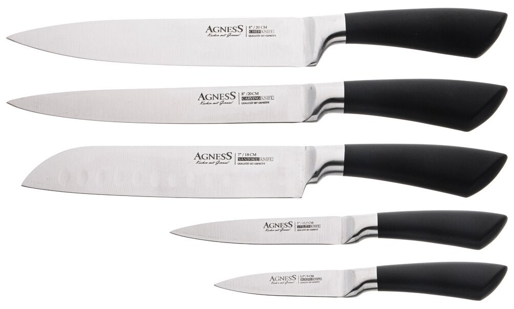 Нож поварской 20см, Нож для нарезки 20см, Нож сантоку 18 см. Нож универсальный 12,5см, Нож для чистки овощей и фруктов, 9см, Удобная подставка для безопасного хранения ножей