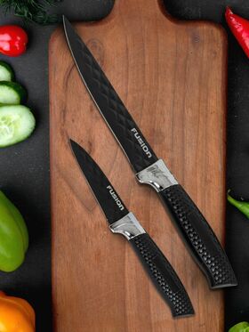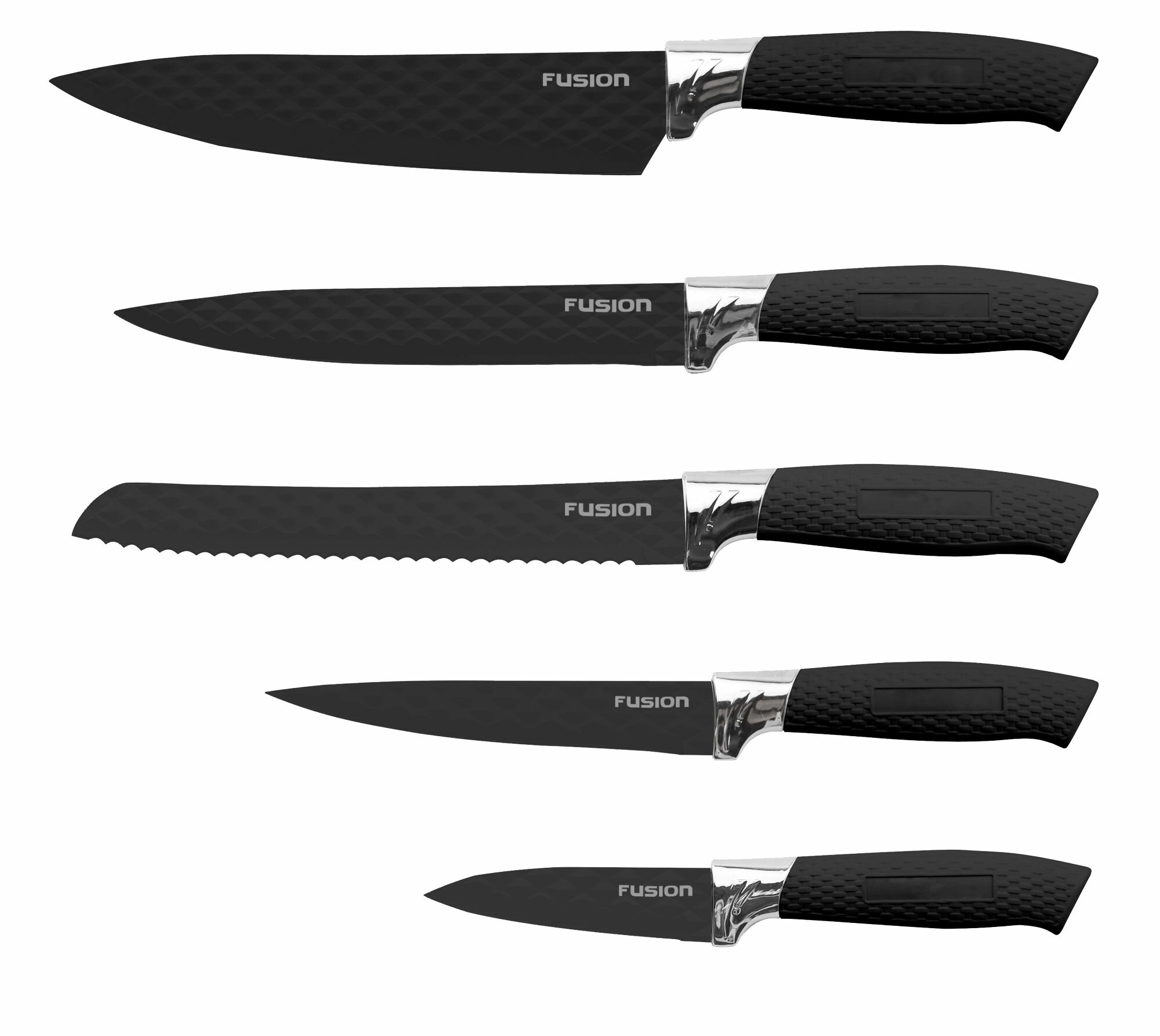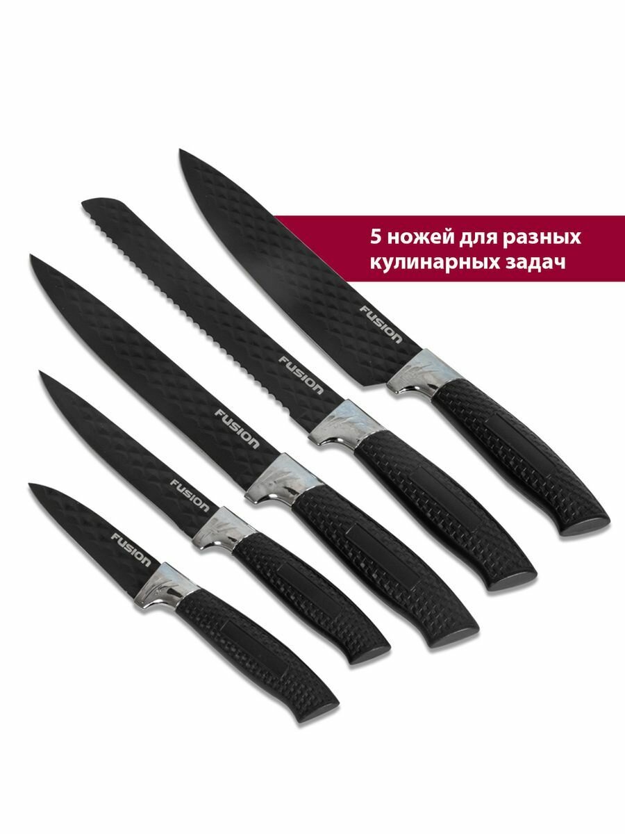 В набор входит: Нож для чистки овощей и фруктов, универсальный нож, нож сантоку, нож для хлеба, шеф-нож поварской, ножницы кухонные. Многофункциональный комплект и 5 кухонных ножей и ножниц. Возможности этого набора охватывают весь необходимый на кухне спектр действий. Они позволяют без проблем работать практически с любыми продуктами.