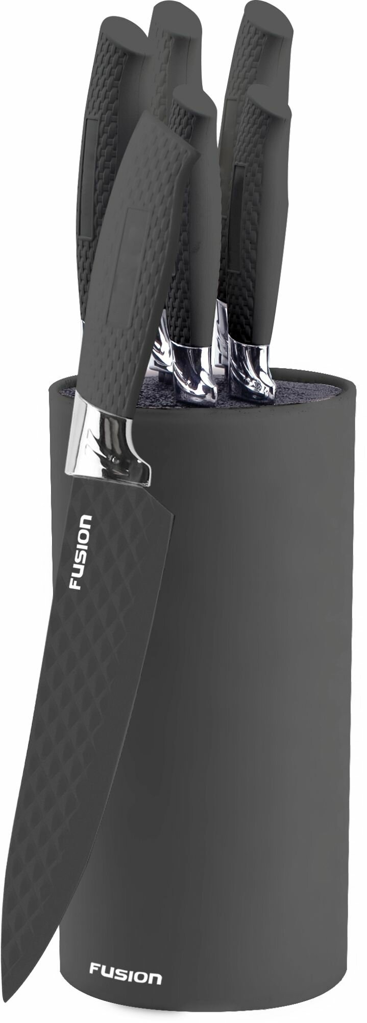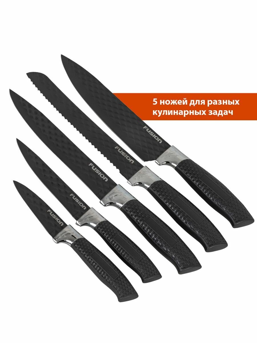 В набор входит: Нож для чистки овощей и фруктов, универсальный нож, нож сантоку, нож для хлеба, шеф-нож поварской, ножницы кухонные. Многофункциональный комплект и 5 кухонных ножей и ножниц. Возможности этого набора охватывают весь необходимый на кухне спектр действий. Они позволяют без проблем работать практически с любыми продуктами.