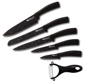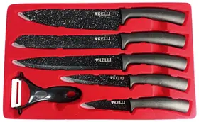Комплектация: нож поварской 20см, нож хлебный 20см, нож для резки 20см, нож универсальный 12см, нож овощной 9см, овощечистка