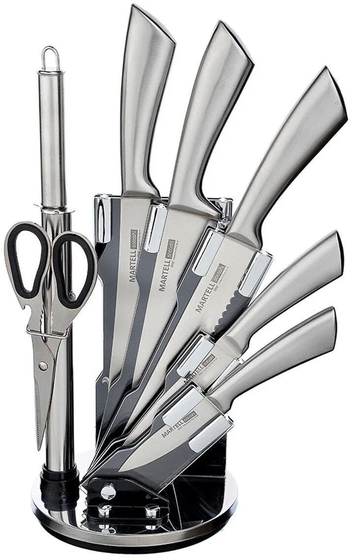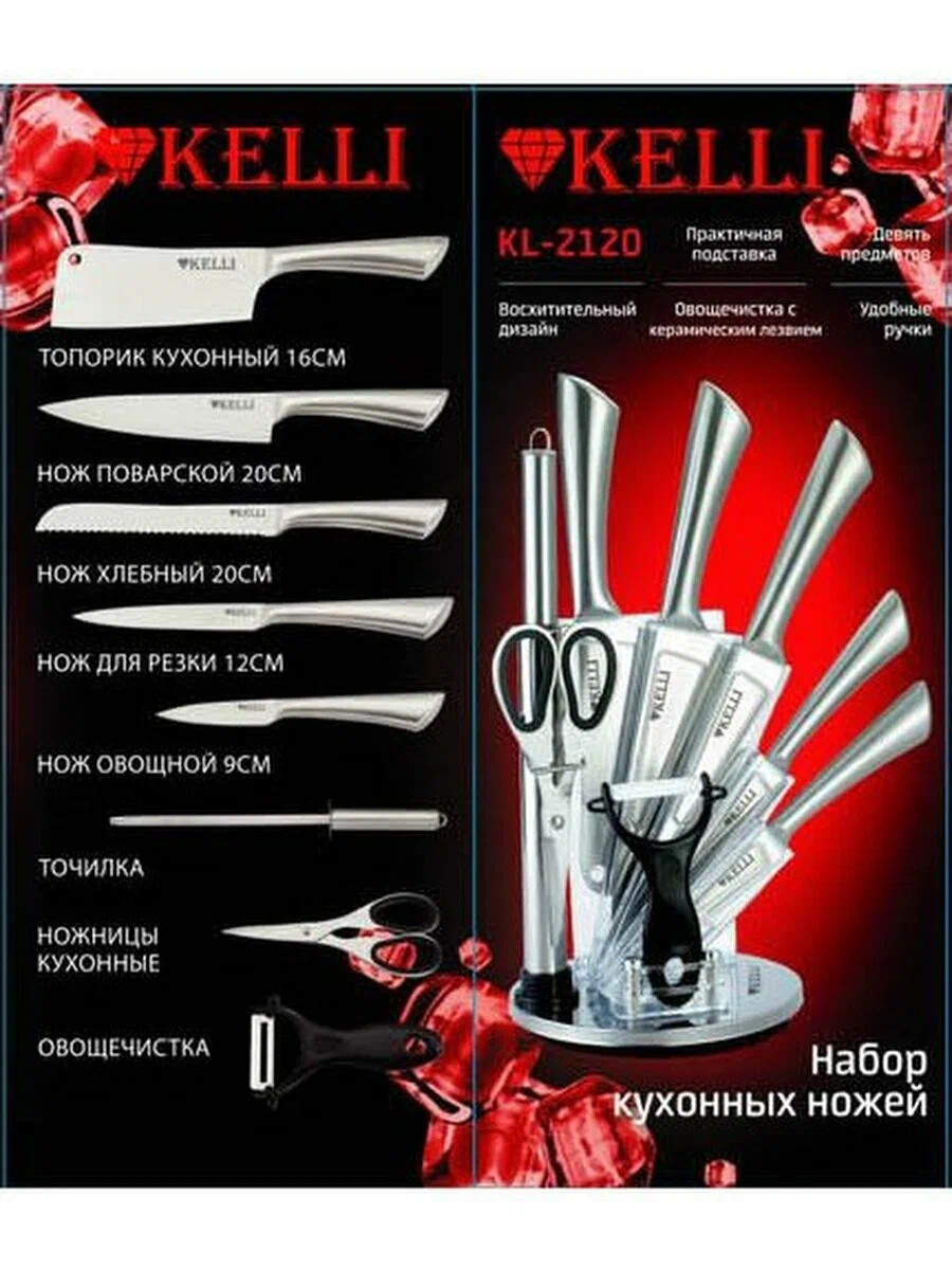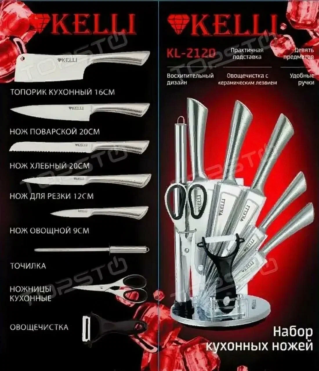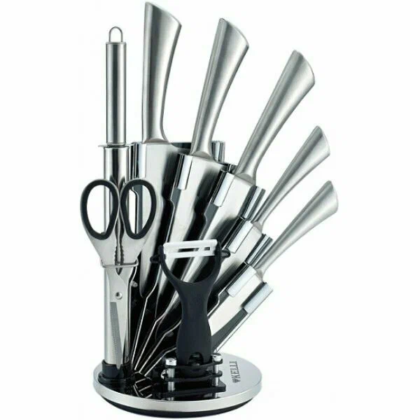 - топорик кухонный 16 см; - нож поварской 20 см; - нож хлебный 20 см; - нож для резки 12 см; - нож овощной 9 см; - кухонные ножницы; - точилка; - овощечистка; - подставка
