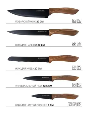 Набор ножей на подставке является практичным и стильным дополнением для вашей кухни. Независимо от того, нужны ли вам ножи для нарезки мяса, овощей или хлеба, этот набор имеет все необходимое.