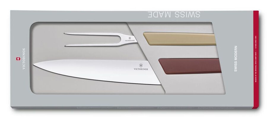 Вилка и нож швейцарского производства. Идеальный набор для разделки любого мяса, независимо от размера куска. Лезвия из нержавеющей, износостойкой стали и синтетические ручки